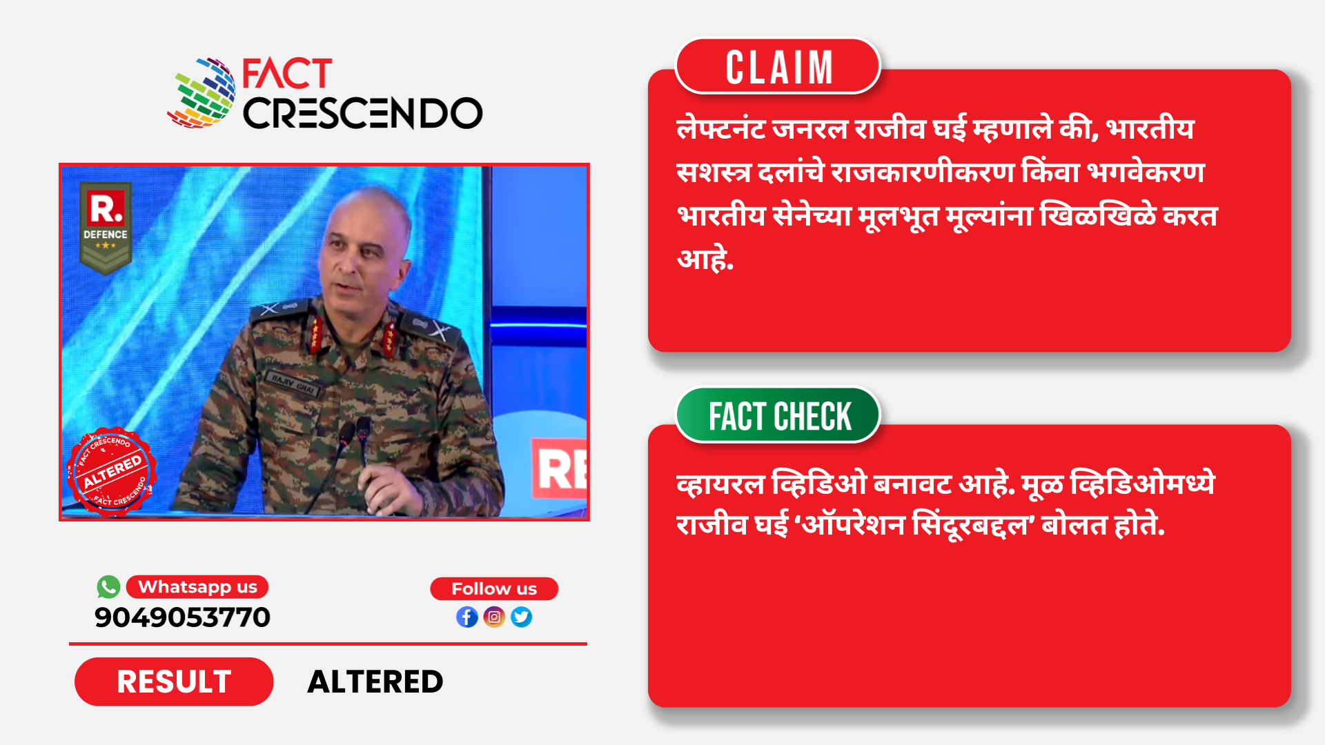 यावरुन सिद्ध होते की, व्हायरल बनावट आहे. लेफ्टनंट जनरल राजीव घई यांनी भारतीय सशस्त्र दलांचे राजकारणीकरण किंवा भगवेकरण होत असल्याचे विधान केले नाही. मूळ व्हिडिओमध्ये ते ‘ऑपरेशन सिंदूरबद्दल’ सांगतात. खोट्या दाव्यासह व्हिडिओ व्हायरल होत आहे.