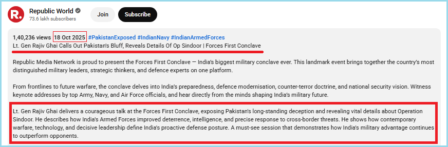 तसेच व्हिडिओच्या डिस्क्रिप्शनमध्ये लिहिले होते की, “लेफ्टनंट जनरल राजीव घई यांनी ‘फोर्सेस फर्स्ट कॉन्क्लेव्ह’मध्ये दिलेल्या भाषणात पाकिस्तानच्या दीर्घकाळ चालत आलेल्या फसवणुकीचे पर्दाफाश केले आणि ‘ऑपरेशन सिंदूर’ संबंधी महत्त्वाच्या तपशीलांची माहिती दिली. त्यांनी स्पष्ट केले की, भारताच्या सशस्त्र दलांनी सीमापार धोके ओळखण्यासाठी प्रतिबंधक क्षमता, गुप्तचर यंत्रणा आणि अचूक प्रतिसाद देण्याची ताकद कशी वाढवली. तसेच त्यांनी आधुनिक युद्धतंत्र, तंत्रज्ञान आणि निर्णायक नेतृत्व हे भारताच्या सक्रिय संरक्षण धोरणाचे प्रमुख घटक असल्याचे सांगितले.”