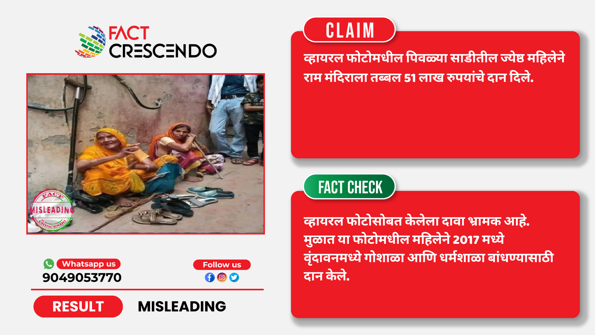 यावरुन सिद्ध होते की, व्हायरल फोटोमधील ज्येष्ठ महिलेने राम मंदिराला नाहीतर 6 वर्षांपूर्वी वृंदावनातील एक गोशाळा बांधण्यासाठी देणगी दिली होती. भ्रामक दाव्यासह हा फोटो व्हायरल होत आहे.