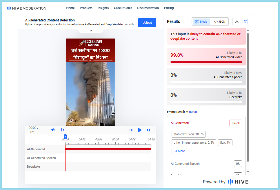 व्हिडिओची तांत्रिक तपासणी करण्यासाठी तो “हाइव मॉडरेशन” या टूलवर तपासण्यात आला. या टूलच्या रिपोर्टनुसार, हा व्हिडिओ एआयच्या मदतीने तयार करण्यात आला आहे आणि तो कोणत्याही खऱ्या घटनेशी संबंधित नाही.