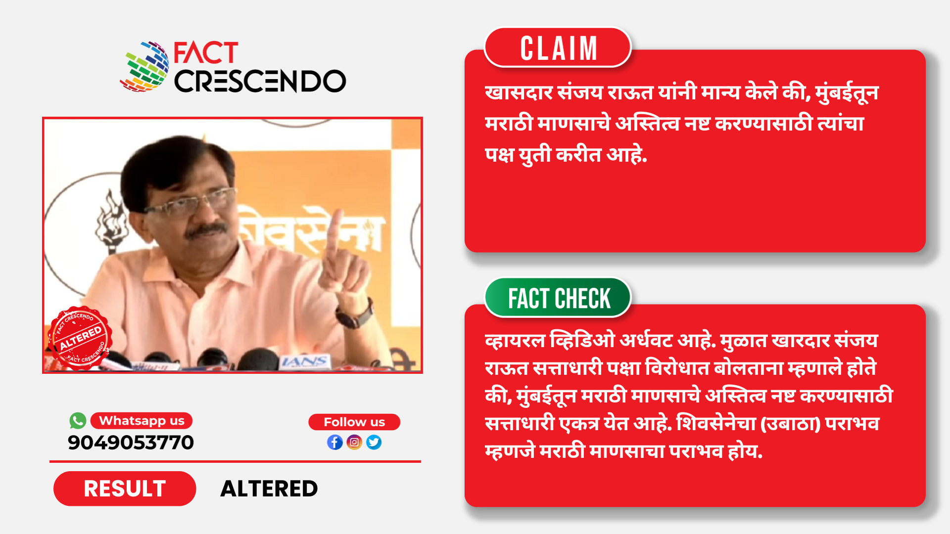 यावरुन सिद्ध होते की, व्हायरल व्हिडिओ अर्धवट आहे. मुळात खासदार संजय राऊत स्वपक्षाला मुंबईतील मराठी माणसाचा विरोधी म्हणाले नाही, तर सत्ताधारी पक्षाला म्हणाले होते. खोट्या दाव्यासह व्हिडिओ व्हायरल होत आहे.