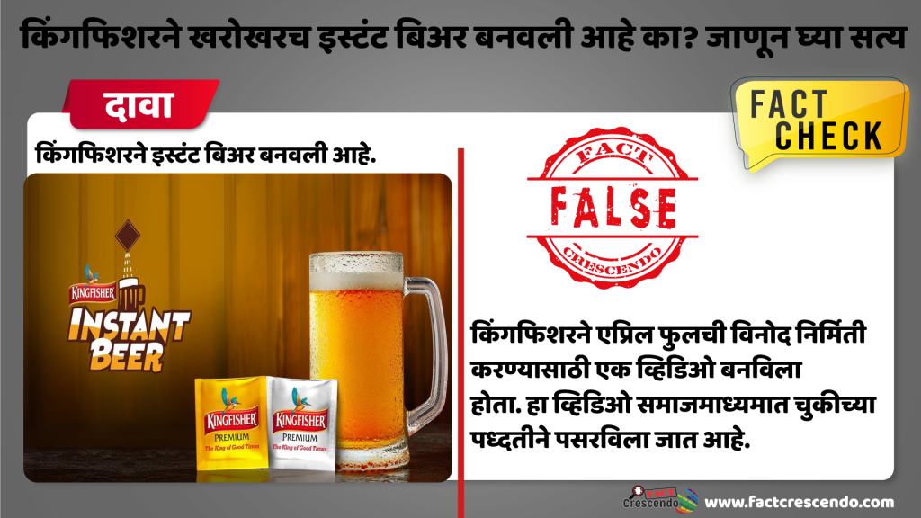 समाजमाध्यमांमध्ये करण्यात येत असलेला किंगफिशरने इस्टंट बिअर बनविला असल्याचा दावा फॅक्ट क्रेसेंडोच्या तथ्य पडताळणीत असत्य आढळला आहे. हा व्हिडिओ एप्रिल फुलच्या विनोद निर्मितीसाठी तयार करण्यात आला होता.