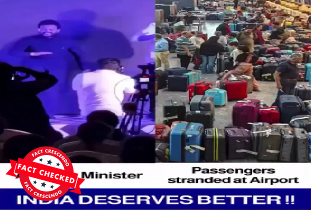 व्हायरल व्हिडिओमधील पहिल्या क्लिपमध्ये प्रवारी आणि त्यांच्या बॅगांचा ढीग तर दुसऱ्या क्लिपमध्ये नागरी उड्डाण मंत्री राम मोहन नायडू स्टेजवर डान्स करताना दिसतात.