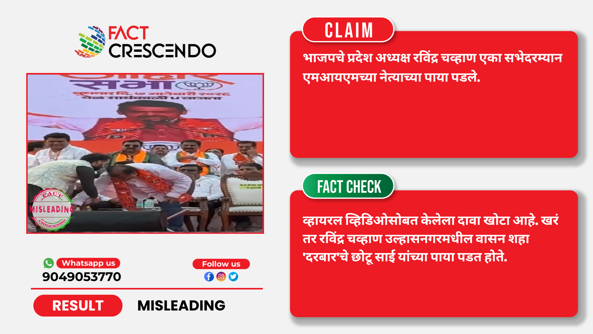 यावरुन सिद्ध होते की, व्हायरल व्हिडिओमध्ये भाजप प्रदेश अध्यक्ष रविंद्र चव्हाण एमआएम नेते नाही तर उल्हासनगरमधील वासन शहा ‘दरबार’चे छोटू साई यांच्या पाया पडत होते. खोट्या दाव्यासह हा व्हिडिओ शेअर केला जात आहे.