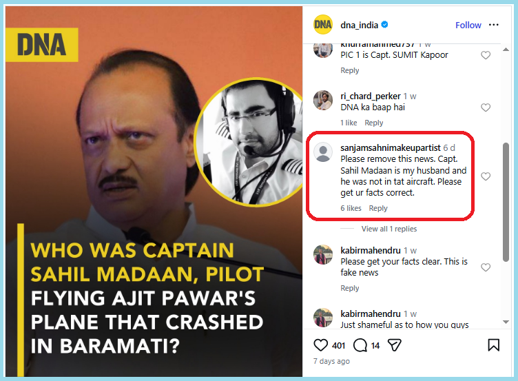 परंतु, या पोस्टवर संजम साहनी नामक महिलेने कमेंट केली की, “कृपया ही बातमी काढून टाका. कॅप्टन साहिल मदान हे माझे पती आहेत आणि ते विमानात नव्हते.”
