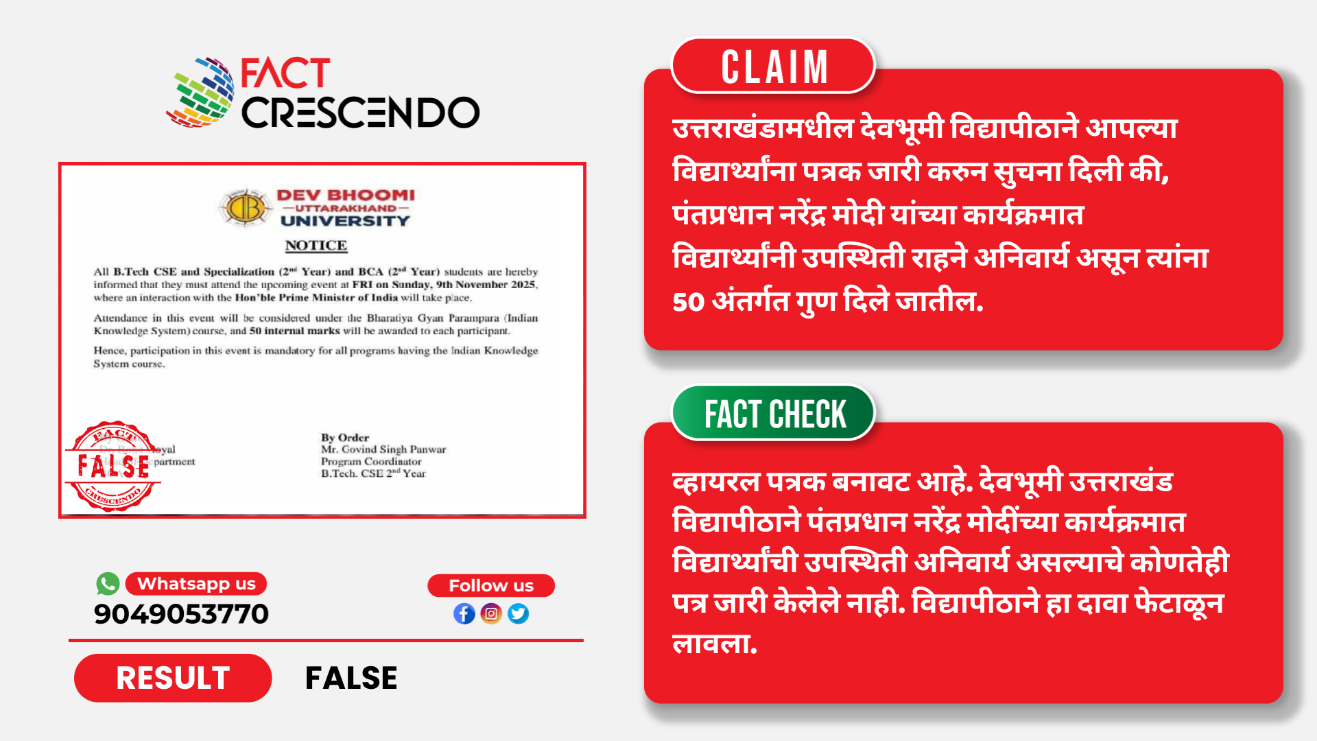यावरुन सिद्ध होते की, व्हायरल पत्रक बनावट आहे. देवभूमी उत्तराखंड विद्यापीठाने पंतप्रधान नरेंद्र मोदींच्या कार्यक्रमात विद्यार्थ्यांची उपस्थिती अनिवार्य असल्याचे कोणतेही पत्र जारी केलेले नाही. विद्यापीठाने हा दावा फेटाळून लावला.