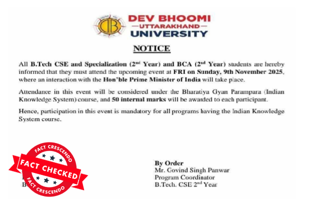 व्हायरल पत्रकात म्हटले आहे की, “सर्व बी.टेक सीएसई आणि स्पेशलायझेशन (द्वितीय वर्ष) आणि बीसीए (द्वितीय वर्ष) विद्यार्थ्यांना कळविण्यात येते की त्यांनी रविवार, 9 नोव्हेंबर 2025 रोजी एफआरआय येथे होणाऱ्या आगामी कार्यक्रमात उपस्थित राहावे, जिथे भारताचे माननीय पंतप्रधानांशी संवाद साधला जाईल. या कार्यक्रमात उपस्थिती भारतीय ज्ञान परंपरा (भारतीय ज्ञान प्रणाली) अभ्यासक्रमांतर्गत विचारात घेतली जाईल आणि प्रत्येक सहभागीला 50 अंतर्गत गुण दिले जातील. म्हणून, भारतीय ज्ञान प्रणाली अभ्यासक्रम असलेल्या सर्व कार्यक्रमांसाठी या कार्यक्रमात सहभाग अनिवार्य आहे. डॉ. रोहित गोयल विभागप्रमुख बीसीए आणि श्री. गोविंद सिंह पनवार कार्यक्रम समन्वयक (बी.टेक. सीएसई द्वितीय वर्ष) यांच्या आदेशानुसार.”