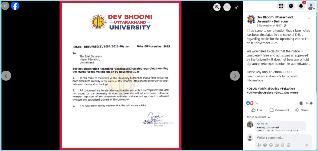 पत्रकात लिहिले होते की, पोस्टच्या कॅप्शनमध्ये असे लिहिले आहे की, “आमच्या लक्षात आले आहे की 9 नोव्हेंबर रोजी होणाऱ्या एफआरआय भेटीसाठी देवभूमी उत्तराखंड विद्यापीठाच्या (डीबीयूयू) नावाने गुणांबाबत एक बनावट सूचना प्रसारित करण्यात आली आहे. आम्ही स्पष्ट करू इच्छितो की ही सूचना पूर्णपणे खोटी असून विद्यापीठाने जारी केलेली नाही. त्यावर कोणतीही अधिकृत स्वाक्षरी, संदर्भ क्रमांक किंवा अधिकृतता नाही. अचूक माहितीसाठी कृपया फक्त अधिकृत डीबीयूयू संप्रेषण चॅनेलवर अवलंबून रहा.”