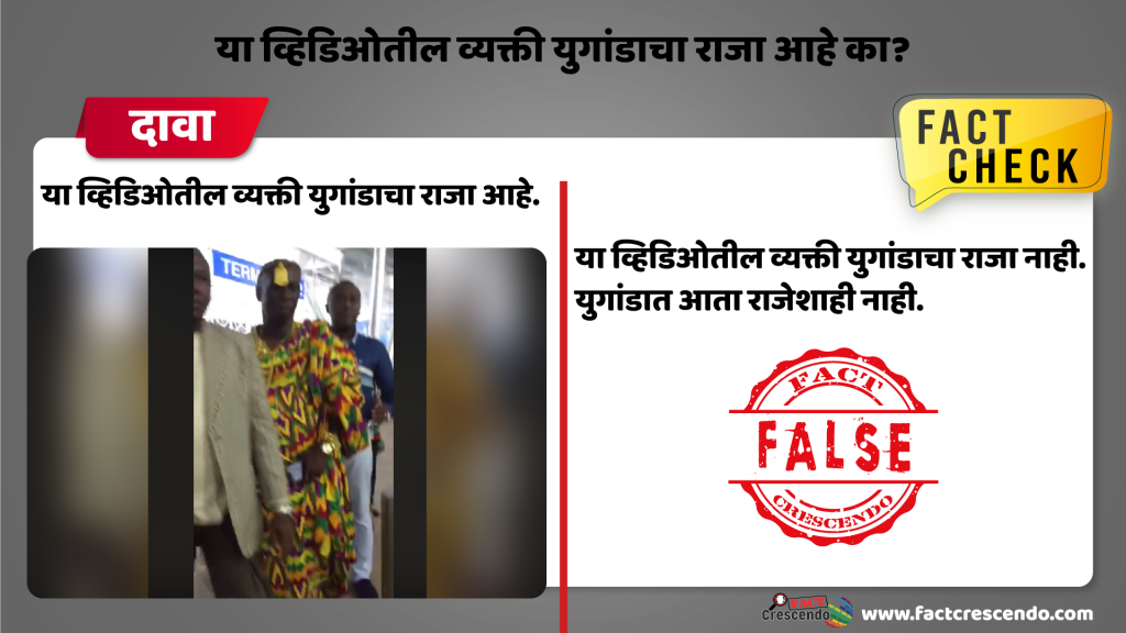 अहमदाबाद विमानतळावर युगांडाचा राजा, त्याची वेशभूषाही आश्चर्यकारक आहे, अशी माहिती देत मदन जैन यांनी एक व्हिडिओ पोस्ट केला आहे. ही व्यक्ती युगांडाचे राजा आहे का, युगांडात आजही राजेशाही आहे का, याची तथ्य पडताळणी फॅक्ट क्रेसेंडोने केली आहे.