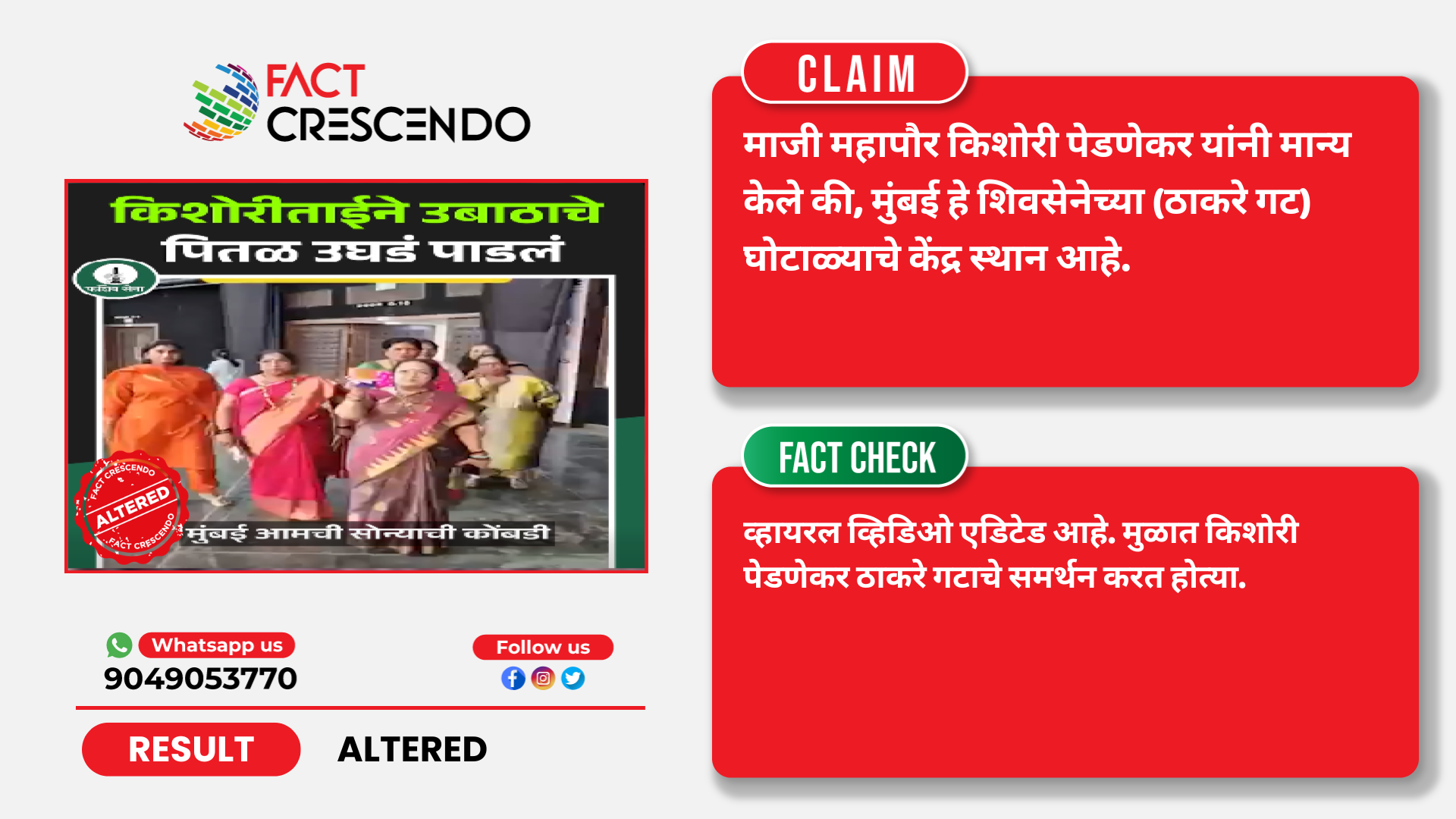 यावरुन सिद्ध होते की, व्हायरल व्हिडिओ एडिट केलेला असून किशोरी पेडणेकर यांनी ठाकरे गटा विरुद्ध कोणतेही वक्तव्य केले नाही. खोट्या दाव्यासह व्हिडिओ पसरवला जात आहे.