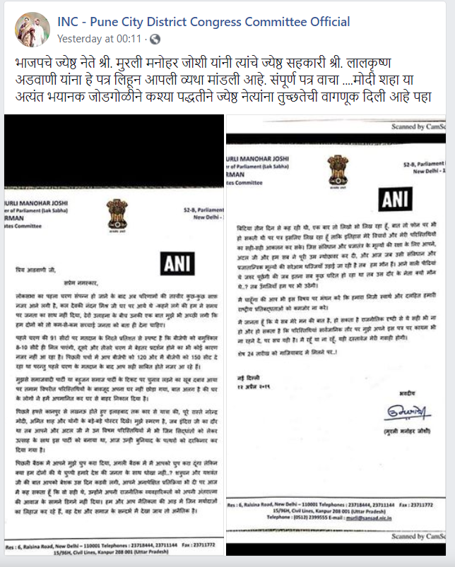 भाजपचे ज्येष्ठ नेते मुरली मनोहर जोशी यांनी त्यांचे ज्येष्ठ सहकारी लालकृष्ण अडवाणी यांना लिहिलेले पत्र बनावट असल्याचे दिसून येत आहे. एएनआय या वृत्तसंस्थेनेही हे पत्र बनावट असल्याचे स्पष्ट केले आहे. दैनिक सामनानेही याबाबतचे वृत्त देताना जोशी यांच्या कार्यालयातून हे पत्र अडवानी यांनी लिहिलेले नाही, असे स्पष्ट म्हटले आहे. त्यामुळे फॅक्ट क्रेसेंडोच्या पडताळणीत ही पोस्ट असत्य आढळली आहे.