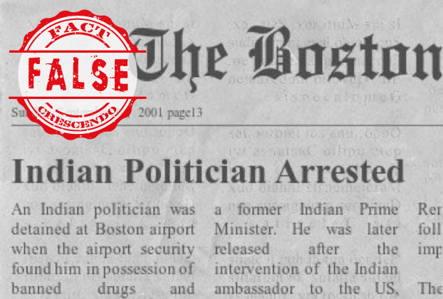 लोकसभा निवडणुकांच्या रणधुमाळीमध्ये अनेक नव्या-जुन्या गोष्ट बाहेर काढल्या जात आहेत. सध्या सोशल मीडियावर एका इंग्रजी बातमीचे कात्रण पसरविले जात आहेत. त्यातील बातमीनुसार, भारताच्या एका माजी पंतप्रधानाच्या मुलाला अमेरिकेतील बॉस्टन शहराच्या विमानतळावर अंमली पदार्थ घेऊन जाताना पकडण्यात आले होते. या बातमीची सतत्या फॅक्ट क्रेसेंडोने तपासली.