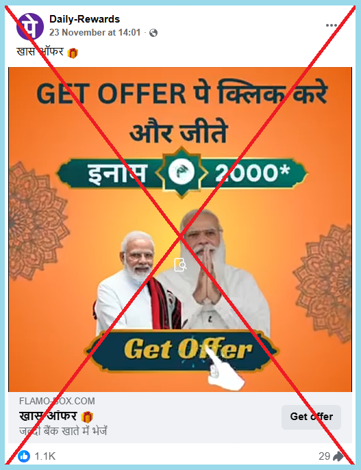 व्हायरल पोस्टमध्ये पंतप्रधान नरेंद्र मोदी यांचे दोन फोटो दाखवले आहेत. त्यासोबत लिहिले आहे, “अभिनंदन! भारतीय जनता पार्टीकडून प्रत्येक बँक खात्यात ५००० रुपयांपर्यंत आर्थिक मदत दिली जात आहे. रक्कम मिळवण्यासाठी Get Offer बटणावर क्लिक करा.”