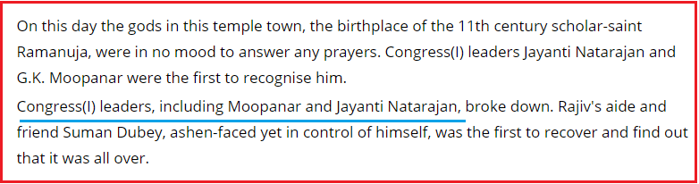 इंडिया टुडेवरील हत्याकांडाविषयीच्या सविस्तर लेखानुसार, सभेला काँग्रेसचे खासदार जी. के मूपनार आणि खासदार जयंती नटराजन उपस्थित होत्या. त्यांनीच सर्वप्रथम राजीव यांचा छिन्नविच्छन्न झालेला मृतदेह ओळखला होता. त्याचबरोबर काँग्रेसच्या ज्येष्ठ नेत्या आणि लोकसभा उमेदवार मार्गाथम् चंद्रशेखर यादेखील यावेळी उपस्थित होत्या. हल्ल्यात त्या गंभीर जखमी झाल्या होत्या. त्यामुळे काँग्रेसचे मोठे नेते या सभेला उपस्थित नव्हते हा दावा असत्य आहे.