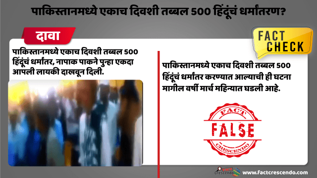 पाकिस्तानमध्ये एकाच दिवशी तब्बल 500 हिंदूंचं धर्मांतर करण्यात आल्याची घटना ही मार्च 2018 मध्ये घडली असल्याचे विविध प्रसारमाध्यमांनी दिलेल्या वृत्तात दिसून येत आहे. अशी घटना पुन्हा घडल्याचे दिसत नाही. फॅक्ट क्रेसेंडोच्या पडताळणीत ही पोस्ट असत्य आढळली आहे.