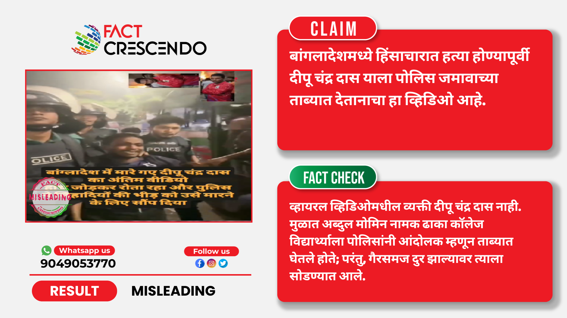 यावरुन सिद्ध होते की, व्हायरल व्हिडिओमधील व्यक्ती दीपू चंद्र दास नाही. मुळात हा अब्दुल मोमिन नामक या ढाका कॉलेज विद्यार्थी असून पोलिसांनी त्याला आंदोलक म्हणून पकडले होते. परंतु, गैरसमज दुर झाल्यावर त्याला सोडण्यात आले. खोट्या दाव्यासह व्हिडिओ व्हायरल होत आहे.