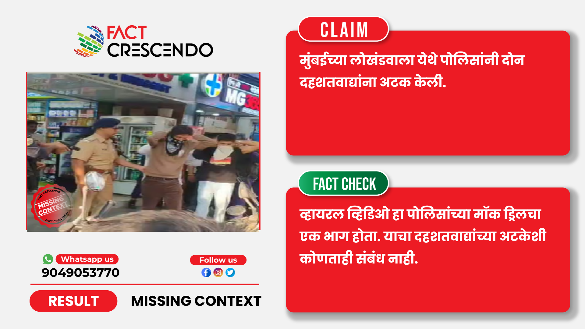 यावरून स्पष्ट होते की, व्हायरल व्हिडिओ मुंबईच्या लोखंडवाला परिसरात पोलिसांनी केलेल्या मॉक ड्रिलचा असून खऱ्या दहशतवाद्यांच्या अटकेचा नाही. भ्रामक दाव्यासह व्हिडिओ व्हायरल होत आहे.