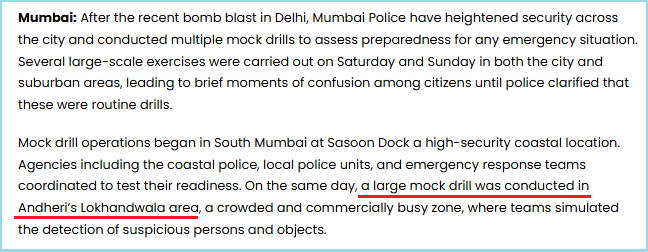 अधिक माहितीनुसार, 10 नोव्हेंबर रोजी लाल किल्ल्याजवळ झालेल्या कार स्फोटानंतर मुंबई आणि दिल्लीमध्ये सुरक्षेसाठी अशा प्रकारच्या मॉक ड्रिल आयोजित करण्यात आल्या होत्या.