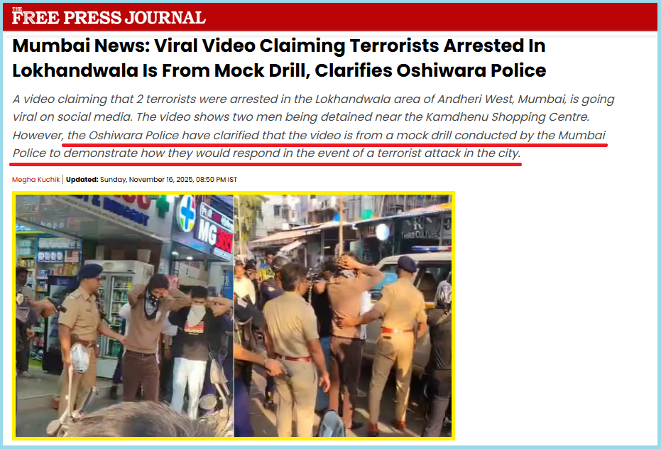 ‘फ्री प्रेस जर्नल’ने 16 नोव्हेंबर 2025 रोजी शेअर केलेल्या रिपोर्टमध्ये व्हायरल व्हिडिओचा स्क्रीनशॉट देत सांगितले की, हा व्हिडिओ मुंबई पोलिसांनी केलेल्या मॉक ड्रिलचा आहे.