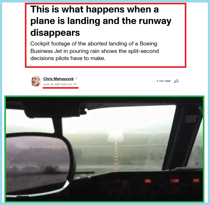 सीएनटीसी नेटवर्क न्यूजने 15 जून 2013 रोजी हाच व्हिडिओ आपल्या वेबसाईटवर शेअर करत घटनेची सविस्तर महिती दिली की, “जोरदार पावसात एक बोईंग बिझनेस जेट धावपट्टीकडे उतरत होतं. सुरुवातीला धावपट्टी स्पष्ट दिसत होती, पण जमिनीपासून सुमारे 200 फूट उंचीवर पोहोचताच अचानक मुसळधार पावसामुळे पूर्ण दृश्यता गायब झाली. अशा वेळी नियमांनुसार पायलटांनी लगेच लँडिंग थांबवून विमान पुन्हा वर नेलं, ज्याला “गो-अराउंड” म्हणतात. नंतर हवामान सुधारल्यावर विमानाने सुरक्षितपणे लँडिंग केलं. या घटनेतून दिसतं की दृश्यता कमी झाली तर पायलट लगेच लँडिंग रद्द करून पुन्हा प्रयत्न करतात, ज्यामुळे प्रवाशांची सुरक्षितता सुनिश्चित होते.”
