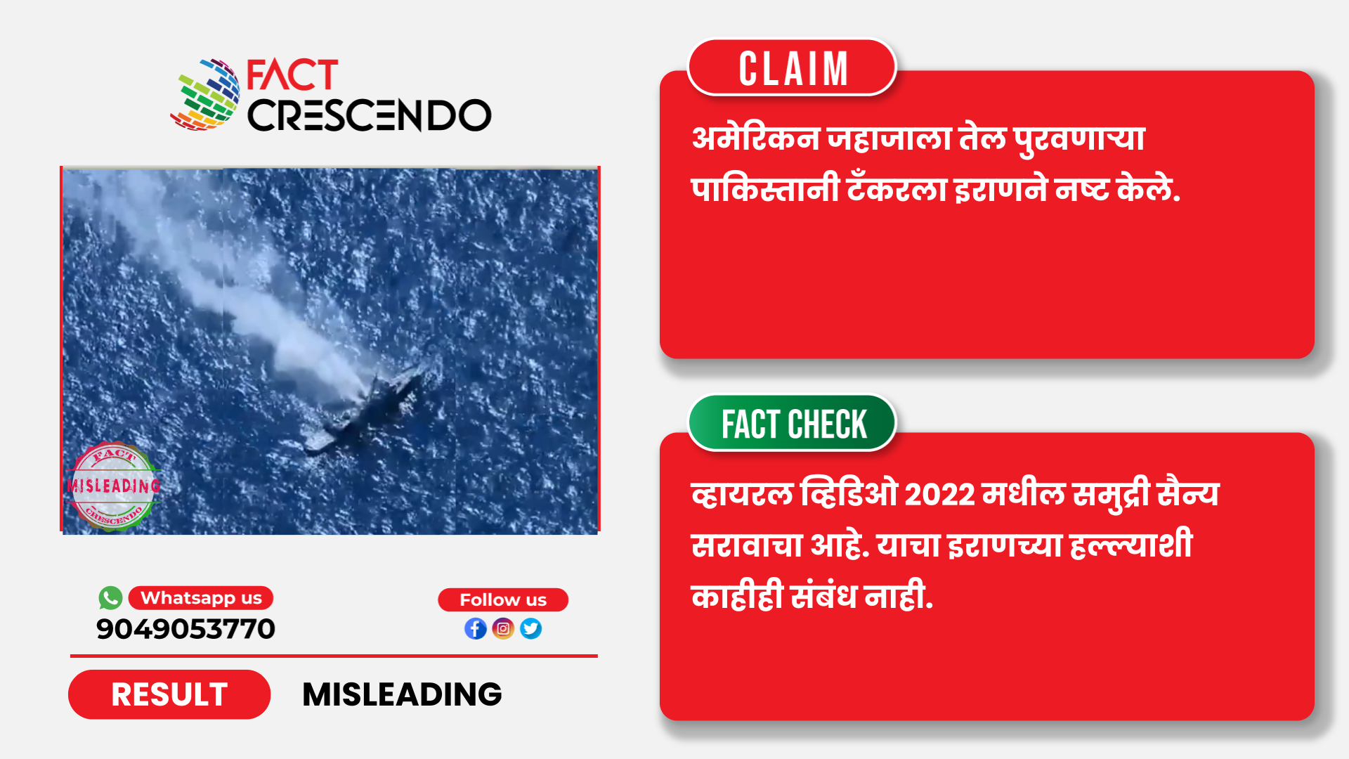 यावरून स्पष्ट होते की, व्हायरल व्हिडिओ 2022 मधील समुद्री सैन्य सरावाचा आहे. याचा इराणने पाकिस्तानी जहाजावर हल्ला केल्याच्या दाव्याशी कोणताही संबंध नाही. दिशाभूल करणाऱ्या दाव्यासह व्हिडिओ व्हायरल होत आहे.