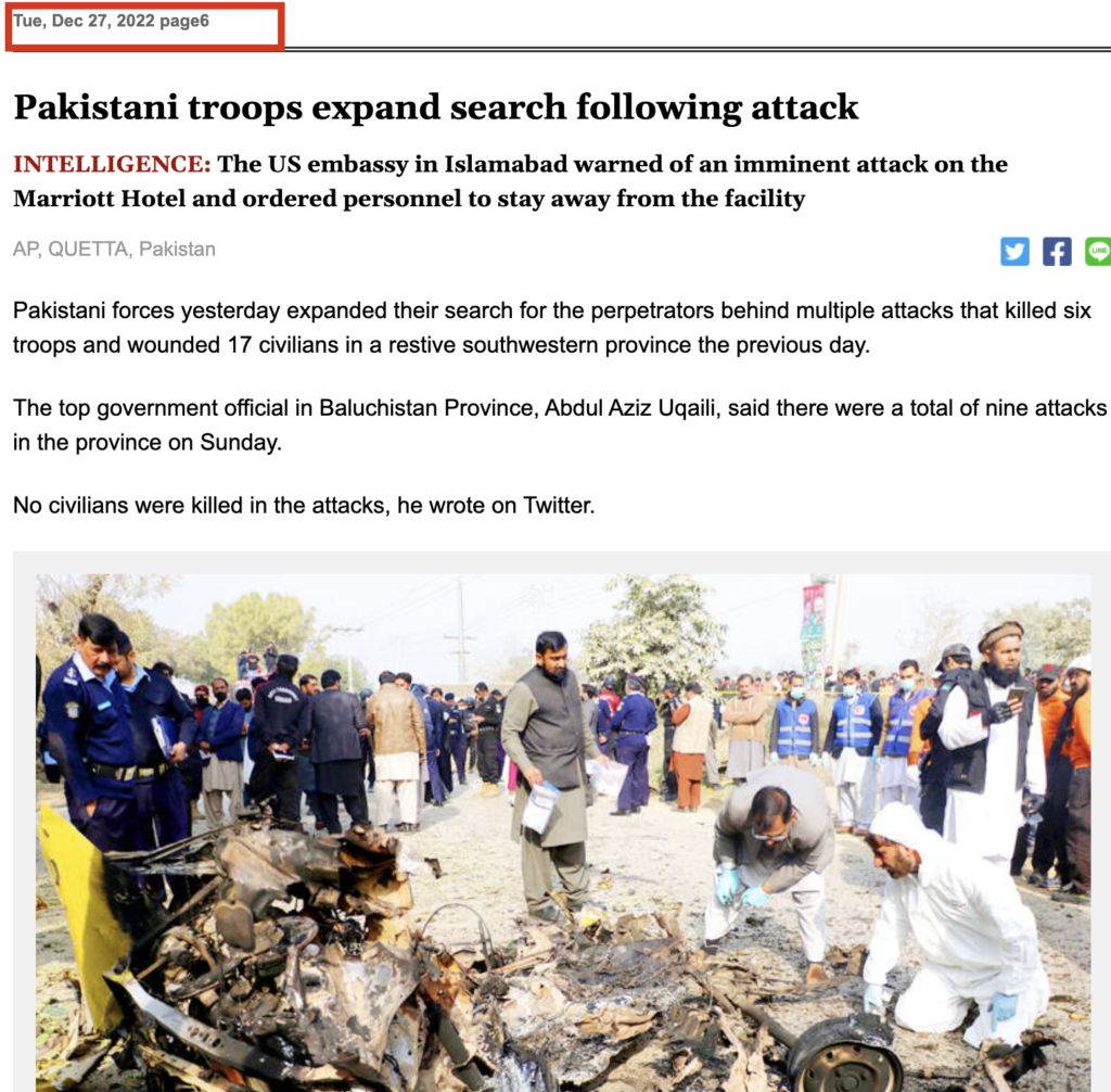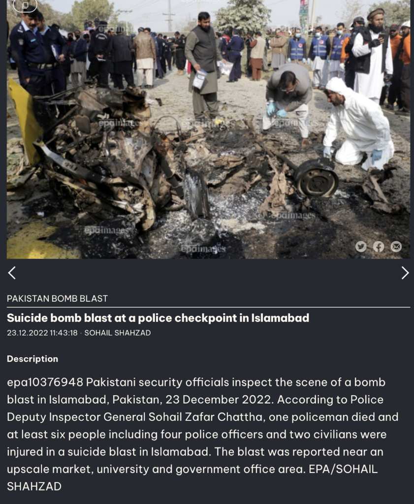 पुढील तपासात आम्हाला ‘epaimages’ या फोटो एजन्सीच्या वेबसाईटवरही हीच फोटो मिळाली. दिलेल्या माहितीनुसार, 23 डिसेंबर 2022 रोजी इस्लामाबादमध्ये एका संशयित कारला अडवण्यात आल्यानंतर त्यातील हल्लेखोराने स्वतःला उडवून दिले होते. या घटनेत एका पोलिसाचा मृत्यू झाला होता, तर चार पोलिसांसह किमान सहा जण जखमी झाले होते.