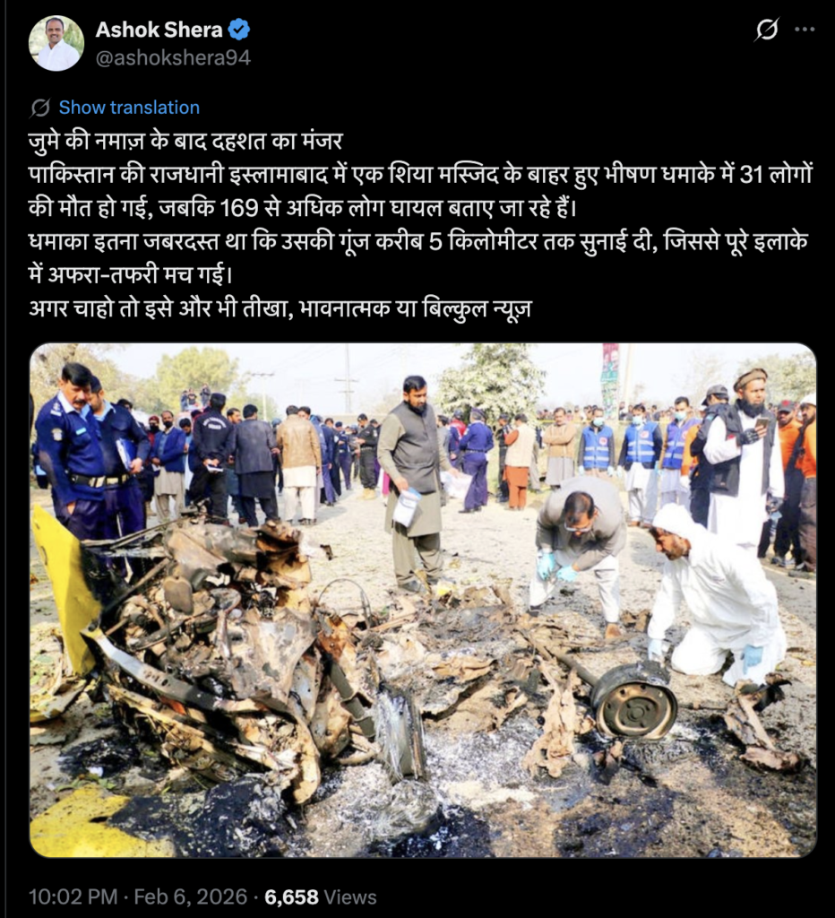 तपासातून स्पष्ट होते की व्हायरल फोटो अलीकडील इस्लामाबादमधील शिया मशिदीतील स्फोटाचा नाही. हा फोटो डिसेंबर 2022 मधील वेगळ्या आत्मघाती हल्ल्यानंतरचा आहे. त्यामुळे व्हायरल दावा खोटा आणि दिशाभूल करणारा आहे.