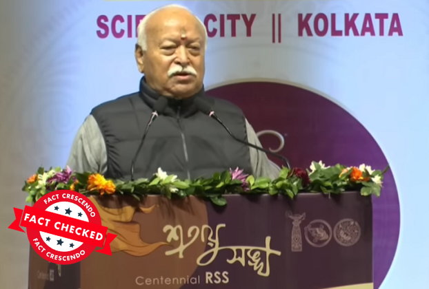 राष्ट्रीय स्वयंसेवक संघाचे प्रमुख मोहन भागवत यांनी पंतप्रधान नरेंद्र मोदींना भारतीय सैन्याला शुद्ध ठेवण्यासाठी तिचे भगवेकरण करण्याचा आदेश दिला, असा दावा करणारा एक व्हिडिओ सोशल मीडियावर व्हायरल होत आहे.  फॅक्ट क्रेसेंडोच्या वाचकांनी हा व्हिडिओ आमच्या व्हॉटसअॅप फॅक्टलाईन क्रमांकवर (9049053770) पाठवून फॅक्ट-चेक करण्याची विनंती केली. पडताळणीअंती कळाले की, व्हायरल व्हिडिओ एडिट केलेला असून मोहन भागवत यांनी […]