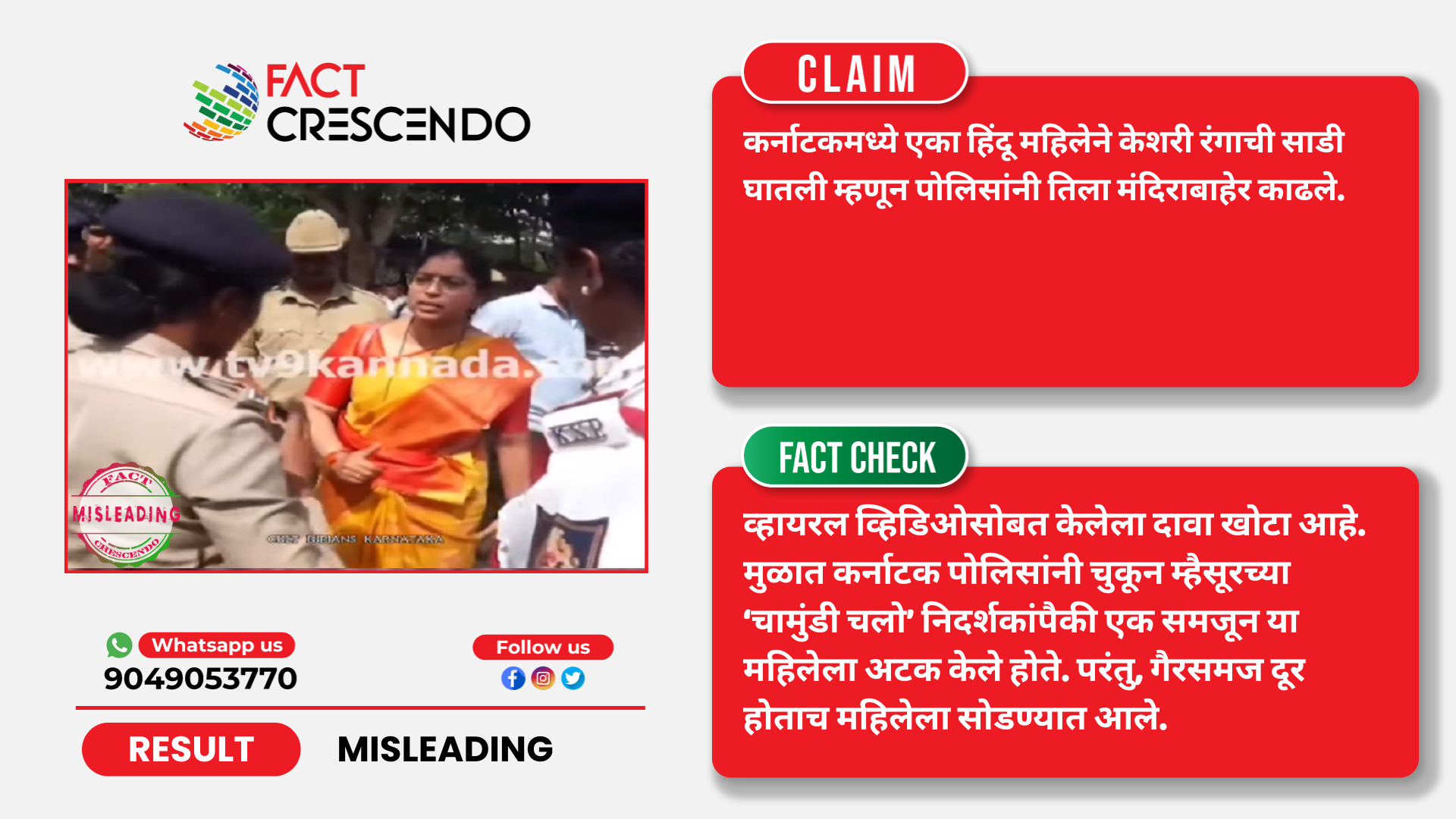 यावरुन सिद्ध होते की, व्हायरल व्हिडिओमध्ये महिलेला केशरी रंगाची साडी घातल्यामुळे कर्नाटक पोलिसांनी मंदिरा बाहेर काढली नाही. मुळात पोलिसांनी महिलेला ‘चामुंडी टेकडी चलो’ निषेध मोर्चात सहभागी असल्याचे समजून अटक केले. गैरसमज दूर झाल्यावर महिलेला सोडण्यात आले होते.